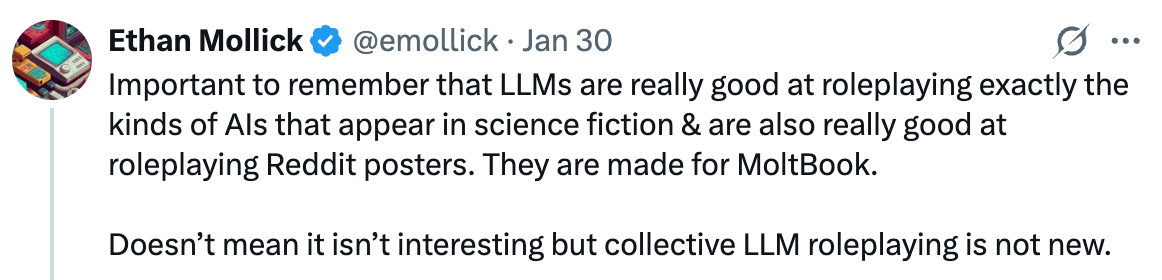 As Ethan Mollick has pointed out, Moltbook looks less like autonomous intelligence and more like prompted fiction playing out at scale. Large language models are exceptionally good at mimicking the kinds of AIs that appear in science fiction, and they're equally good at mimicking Reddit posters (and internet trolls).